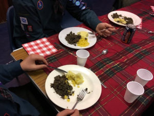 Scouts became the waiters for the evening serving up a choice of soups, followed by haggis, neeps and tatties, cranachan or trifle with coffee and tablet to finish.