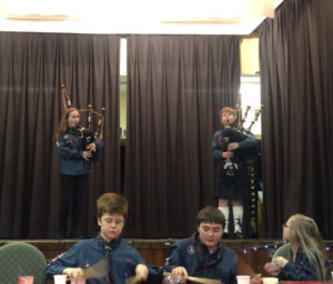 Cameron did the address to the haggis while Zoe piped in the haggis , I did the toast to the lassies with Kirsten and Alisha replying to us laddies (in the weeks leading up to the burns supper we had worked in groups and wrote our own rhyming toasts ) , me and Iona played our bagpipes and Kayla did highland dancing.